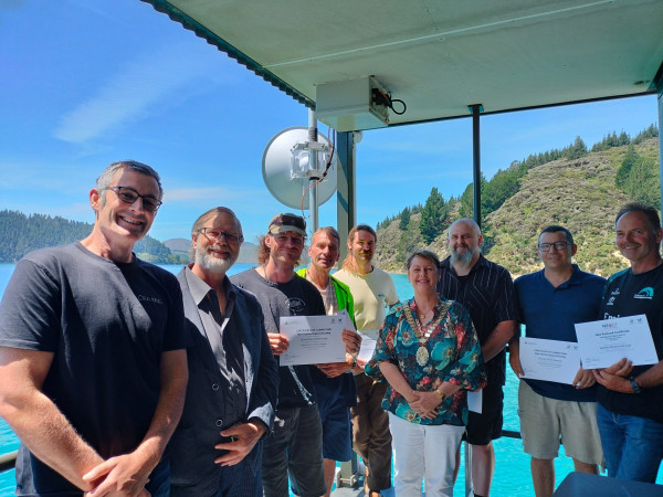 Marlborough Mayor Nadine Taylor (centre) with NZKS team members (left to right): Mark Preece, Salvador Delgado, Dan Frost, Chris Pearce, Simon Berkelmans, Ben Morton, Tiarnan Browne, Gordon Gray.